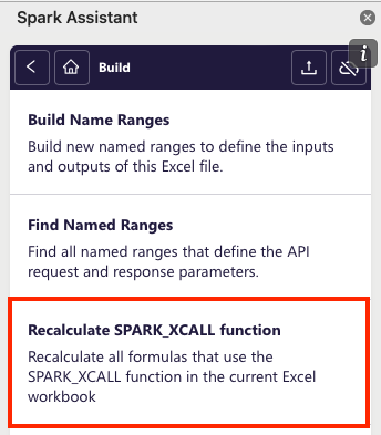 Spark Assistant will refresh all Xcall functions in an Excel file automatically every time you log in, but this manual method is helpful for when you've been away from the file for a long time or if you've uploaded a new version of the service you're calling from your Excel file.