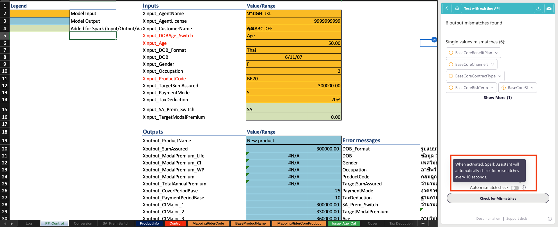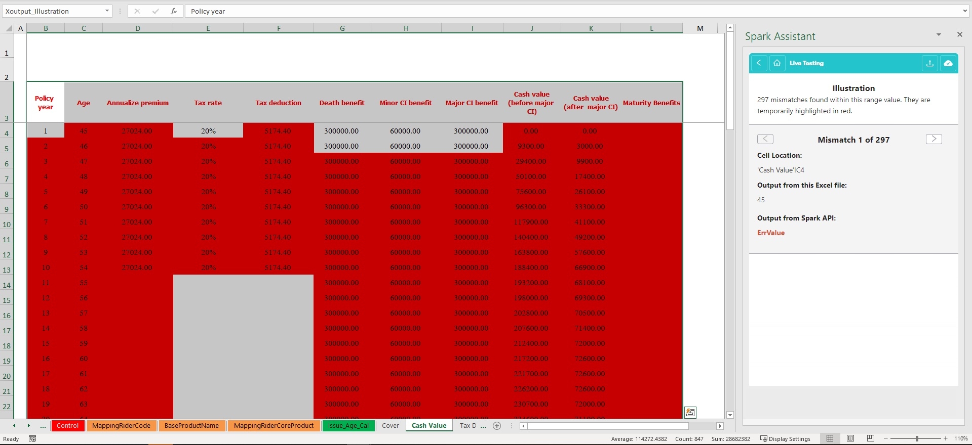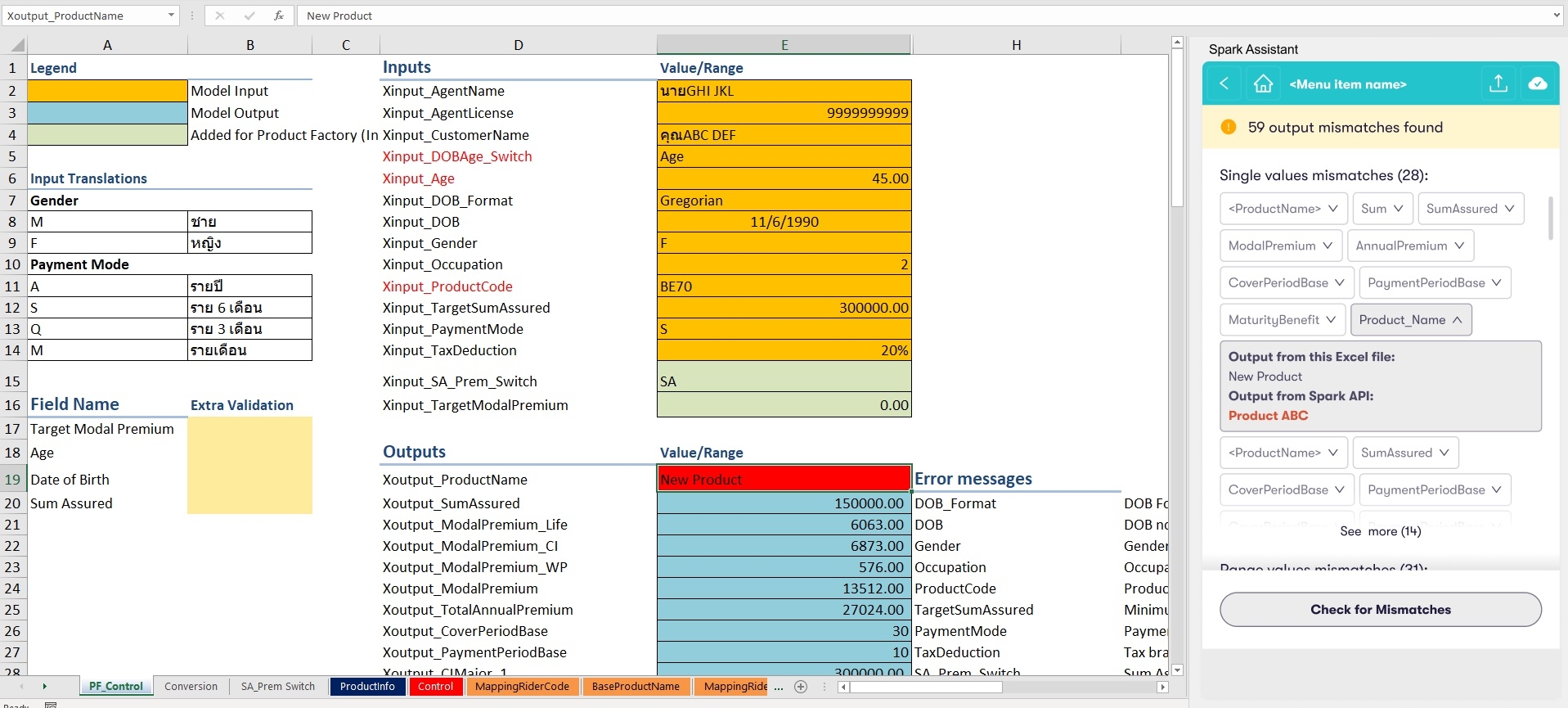 With Spark Assistant Test mode we aim to "close the loop" on testing by allowing users to determine a set of results in Excel and compare that to those determined in Spark via the Testing Center. This eliminates the back-and-forth process needed in traditional model testing. This functionality can then be further extended to enable users to easily create test cases and creatively understand differences in iterations of models.